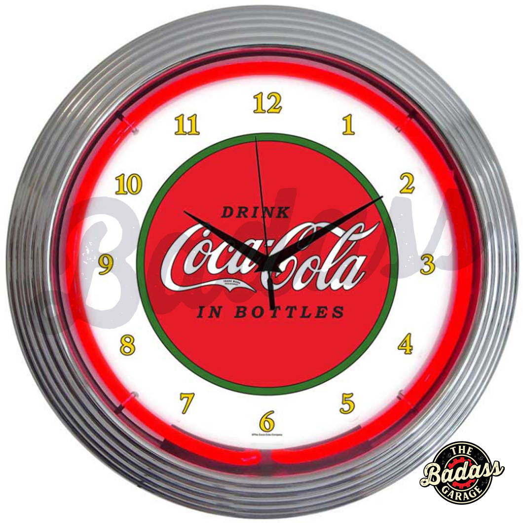 Coca-Cola 1910 Classic Neon Clocks feature a hand blown ring of real glass neon, generating 25 watts of light. The neon clocks have glass faces and feature chrome finished, multi-tiered art deco styles rims. This clock features a chrome rim with a single ring of red neon. The quartz movement clock operates on one AA battery (not included). The neon light is powered by an AC adapter (included) that plugs directly into a wall outlet. Give your home the fabulous glow of real neon! Product Dimensions 15″W x 15″H x 3″D