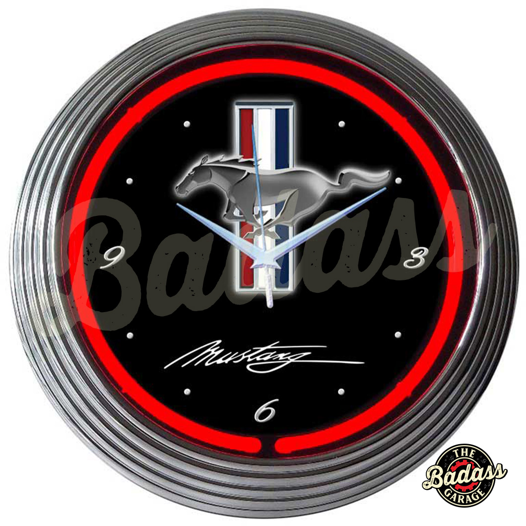 Ford Mustang Neon Clocks feature a hand blown ring of real glass neon, generating 25 watts of light. The neon clocks have glass faces and feature chrome finished, multi-tiered art deco styles rims. This clock features a chrome rim with a single ring of red neon. The quartz movement clock operates on one AA battery (not included). The neon light is powered by an AC adapter (included) that plugs directly into a wall outlet. Give your home the fabulous glow of real neon! Product Dimensions 15″W x 15″H x 3″D