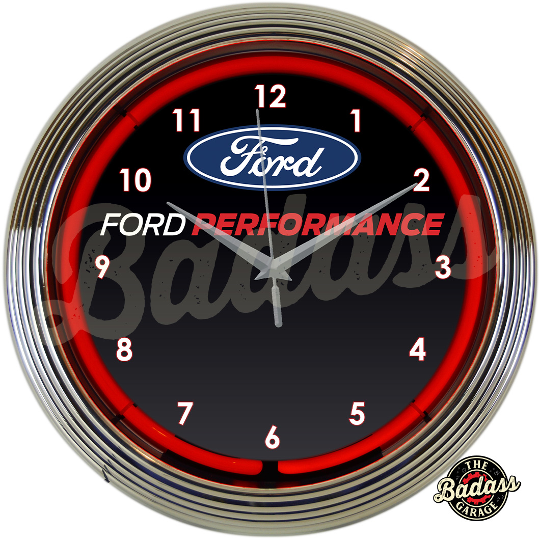 Ford Performance Neon Clocks feature a hand blown ring of real glass neon, generating 25 watts of light. The neon clocks have glass faces and feature multi-tiered art deco styles rims. The Ford Performance neon clock features a chrome rim with a single ring of red neon. The quartz movement clock operates on one AA battery (not included). The neon light is powered by an AC adapter (included) that plugs directly into a wall outlet. Give your home the fabulous glow of real neon! Fully licensed by Ford Motor Company through Neonetics Inc. Ford Officially Licensed Product from Neonetics. For indoor use only. Product Dimensions 15″W x 15″H x 3″D