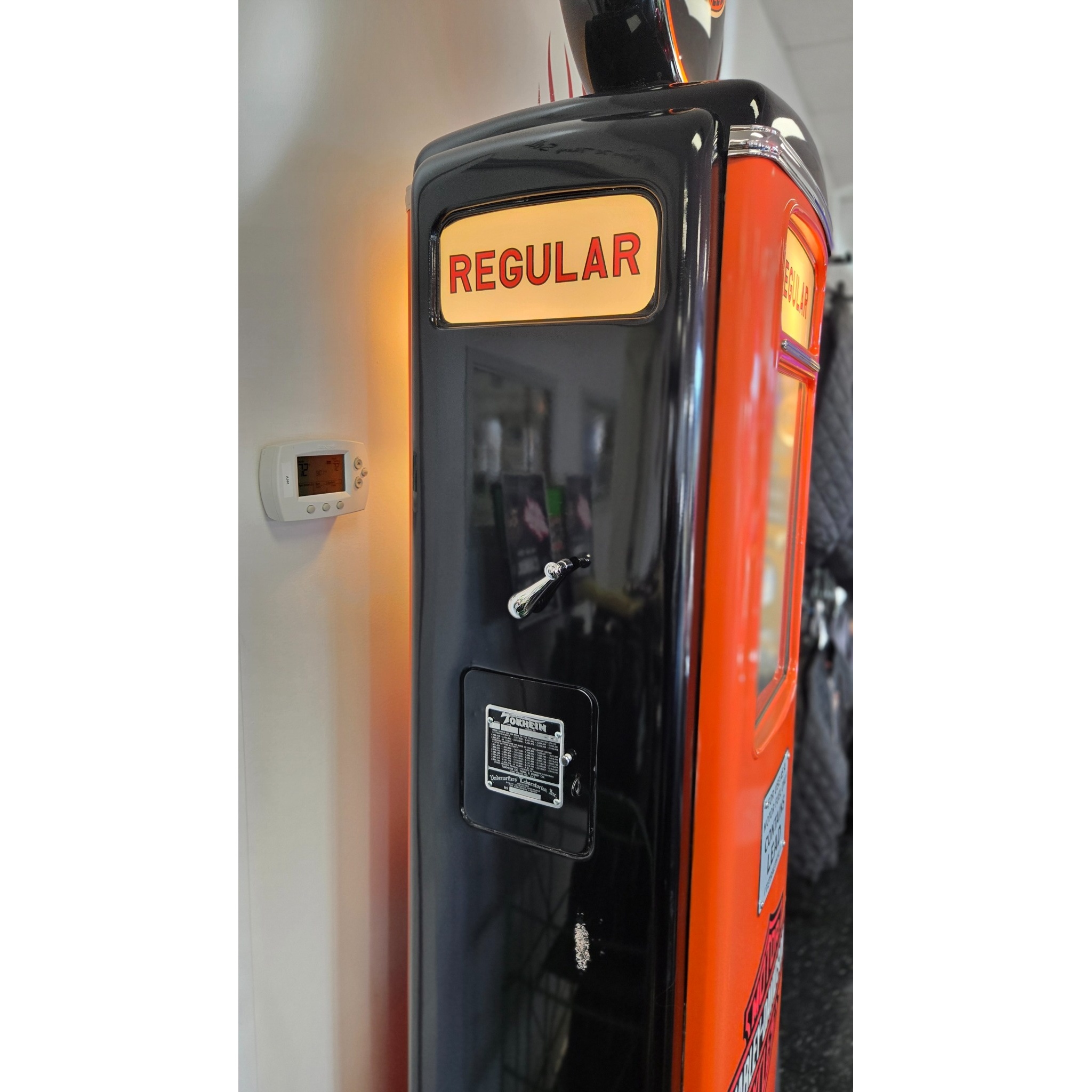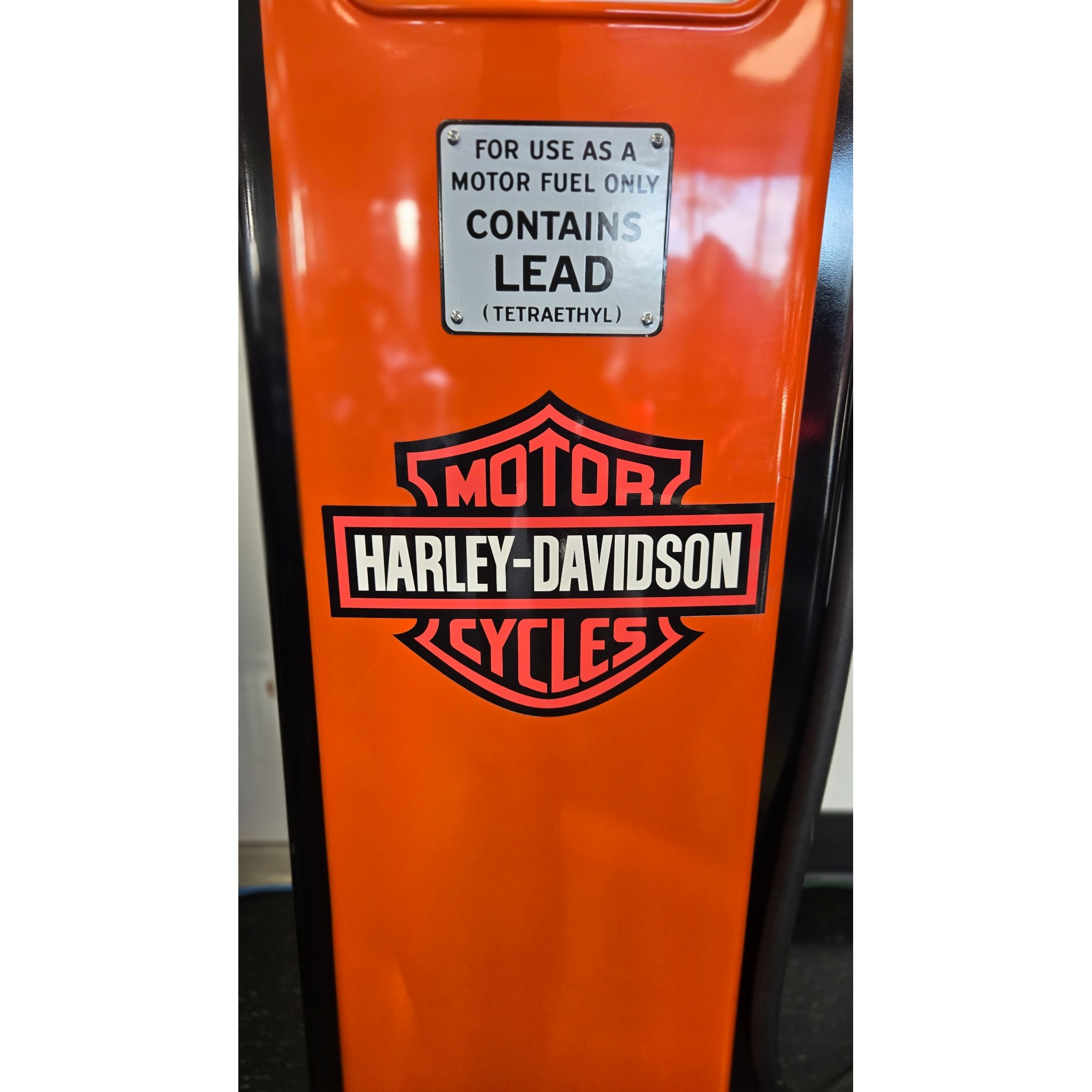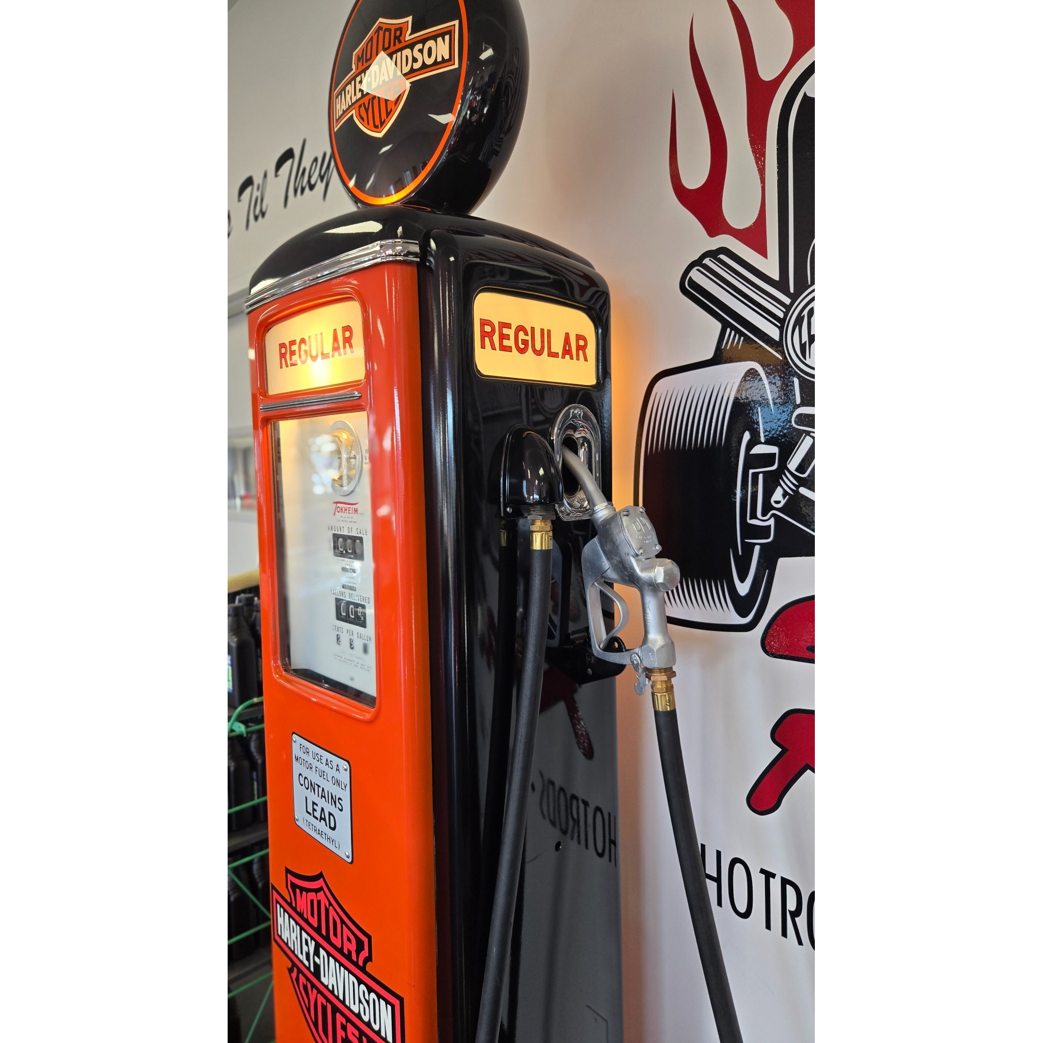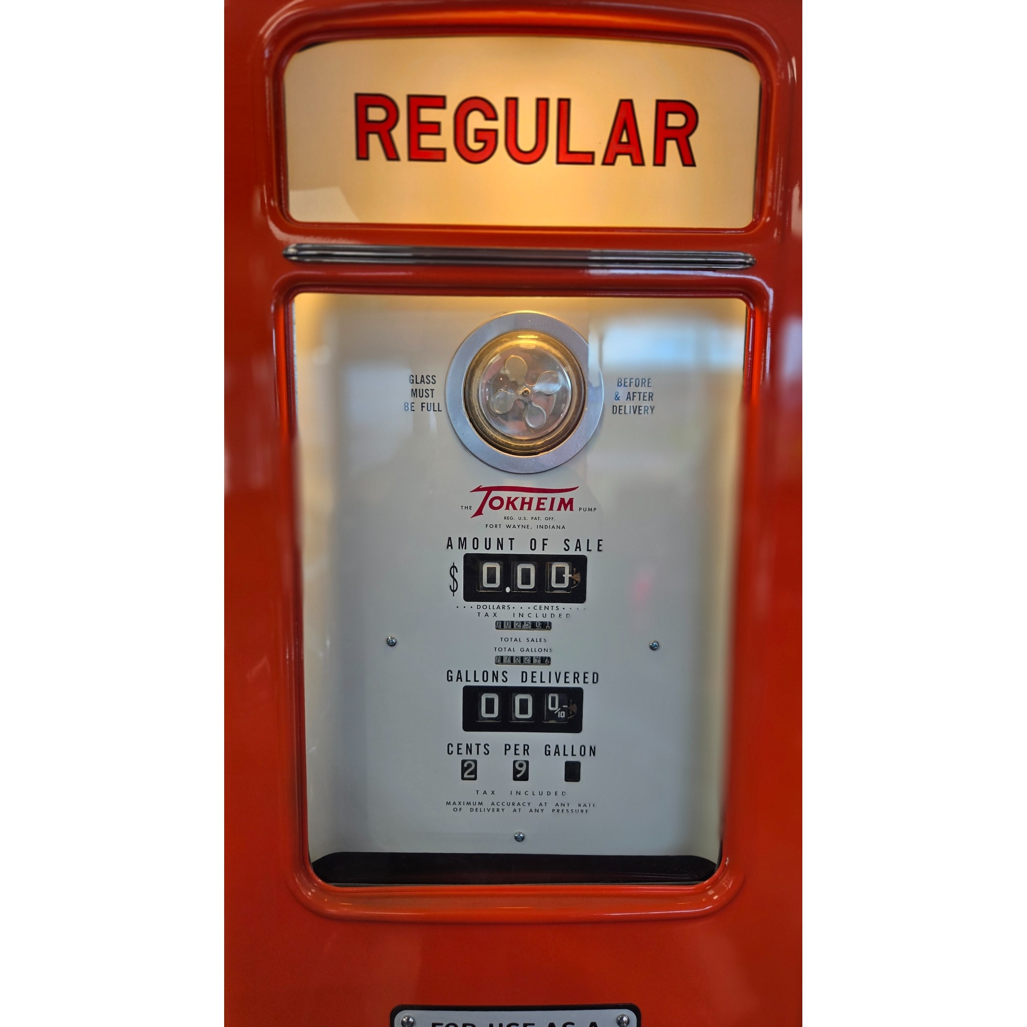 1940’s Tokheim 1939 Model Harley Davidson Tall Electric Gas Pump with four sides. Very nicely restored unit with reproduction glass lenses in the metal globe holder. Inner pump workings have been removed. The unit still lights up nicely on all four sides and on both meters.