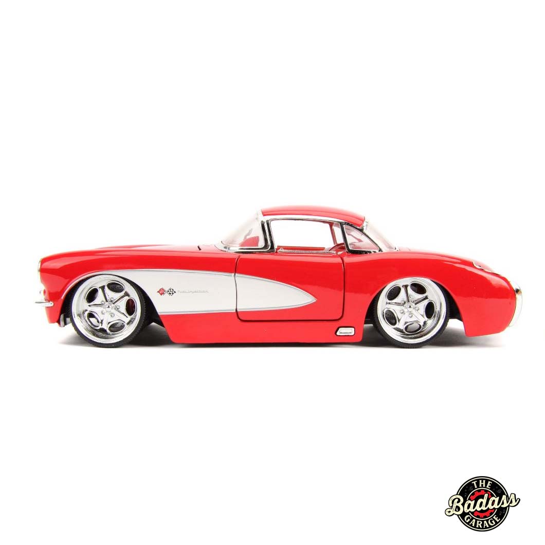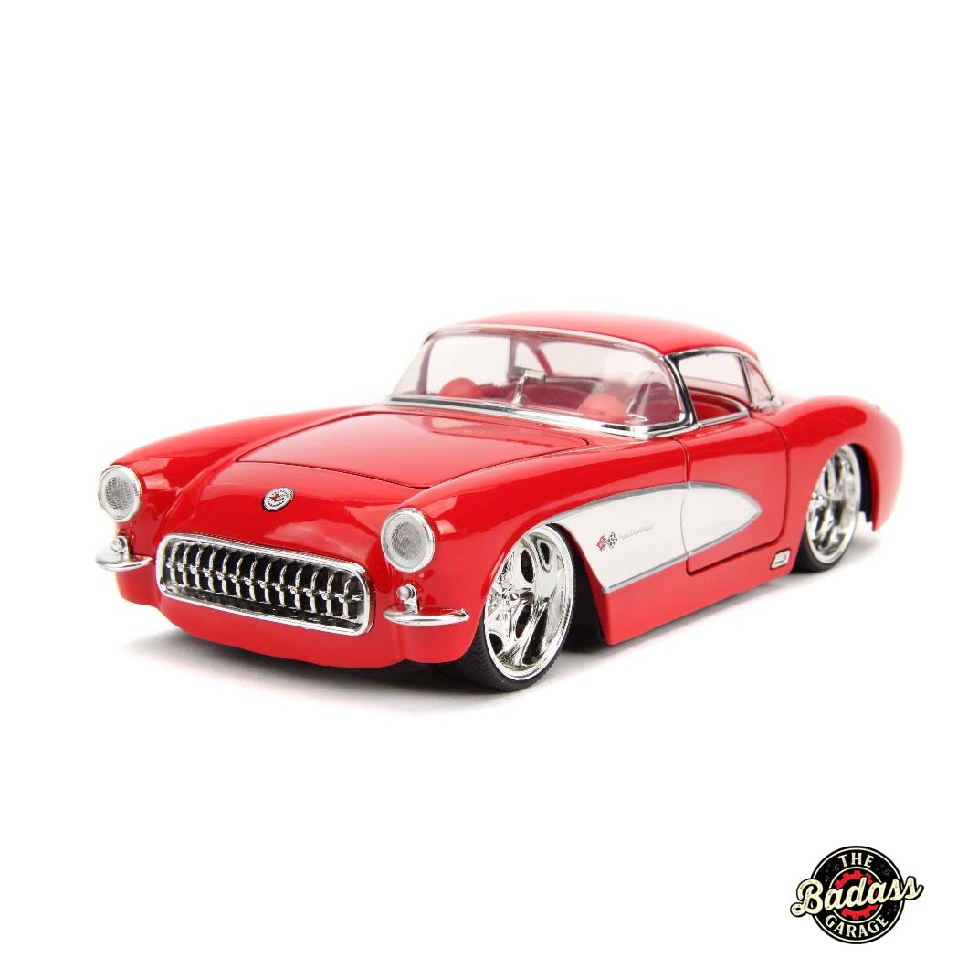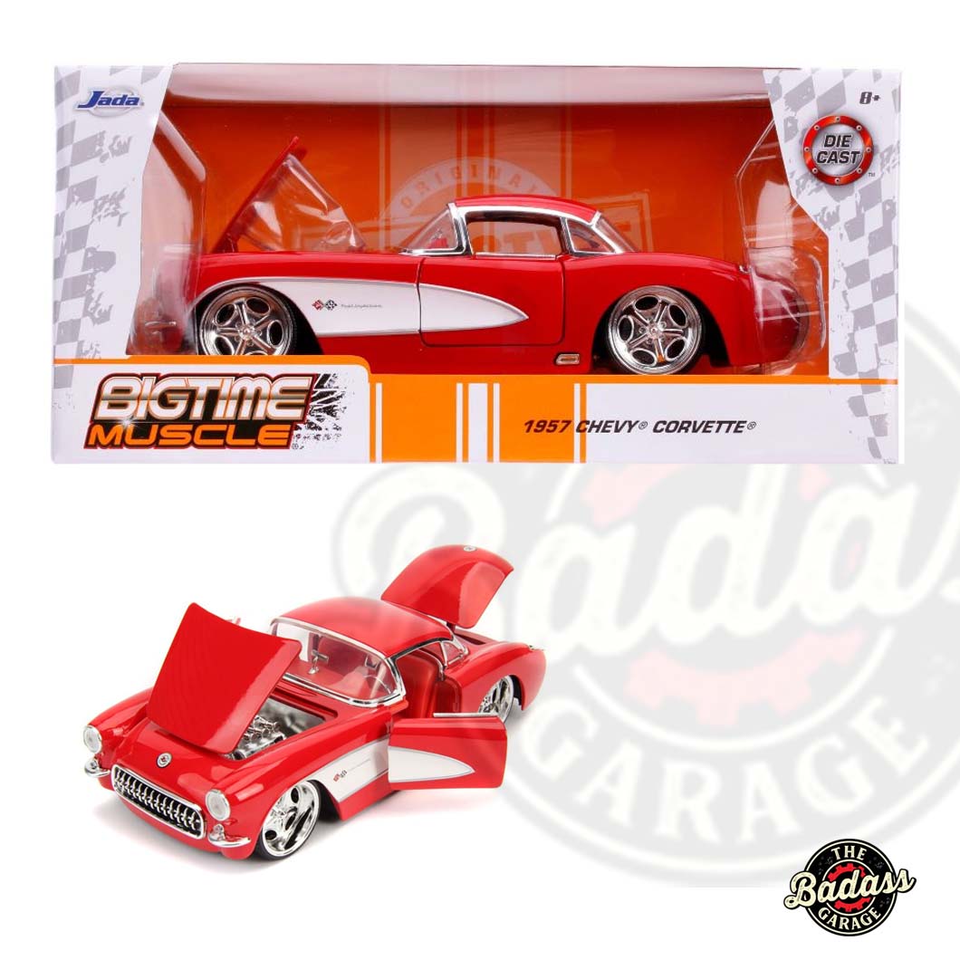 Infuse your collection with a touch of classic elegance with the Jada 1/24 Scale “BIGTIME Muscle” 1957 Chevy Corvette in Glossy Red. This stunning diecast metal model car captures the iconic design and refined style of the 1957 Corvette, enhanced by its radiant glossy red finish. The model’s intricate detailing, from the sleek body lines to the classic chrome accents, pays homage to this legendary sports car. Perfect for both enthusiasts and collectors, the “BIGTIME Muscle” 1957 Chevy Corvette in Glossy Red is a standout addition that brings vintage charm and performance to any display.