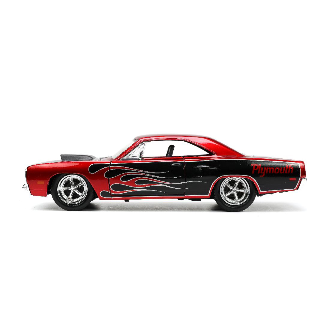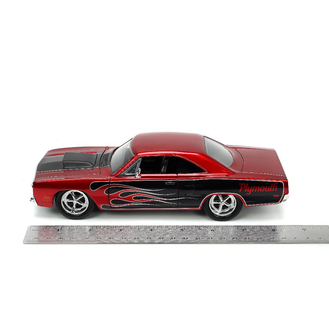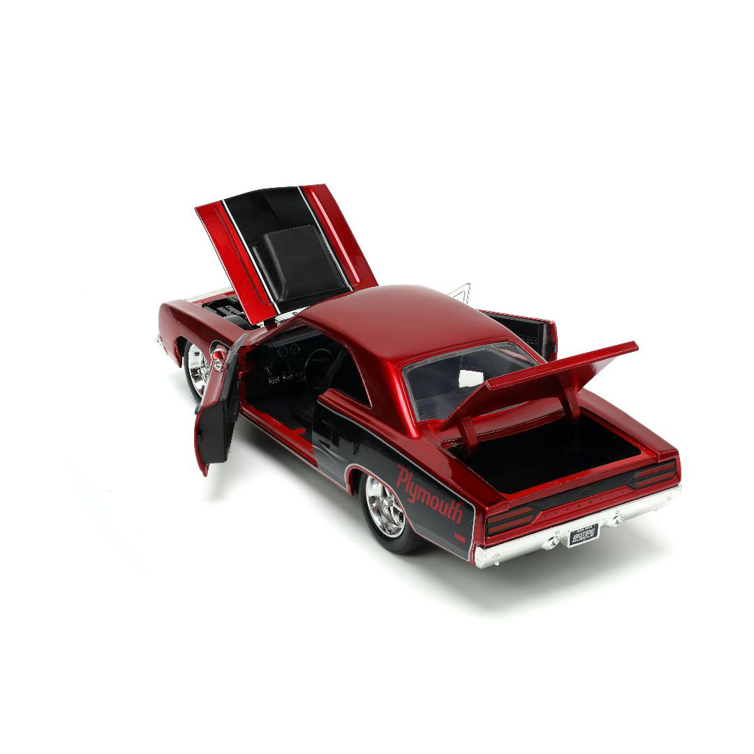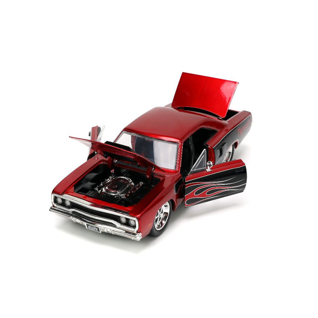 The Jada 1/24 BIGTime Muscle 1970 Plymouth Road Runner is far and away, one of our most popular items. People can’t seem to get enough of it. It’s rich in features like opening doors, hood, and trunk. Also includes a detailed interior, engine compartment, and chassis with a quality Diecast, metal body and highly detailed wheels with chrome accents. Dimensions are approximately L-6.5, W-3, H-2 inches.