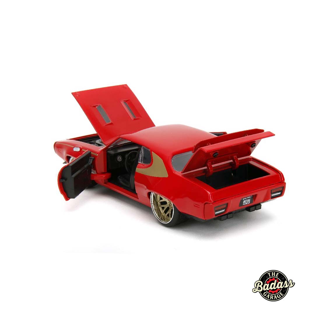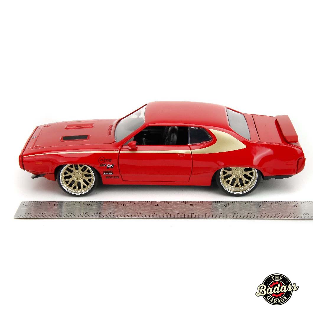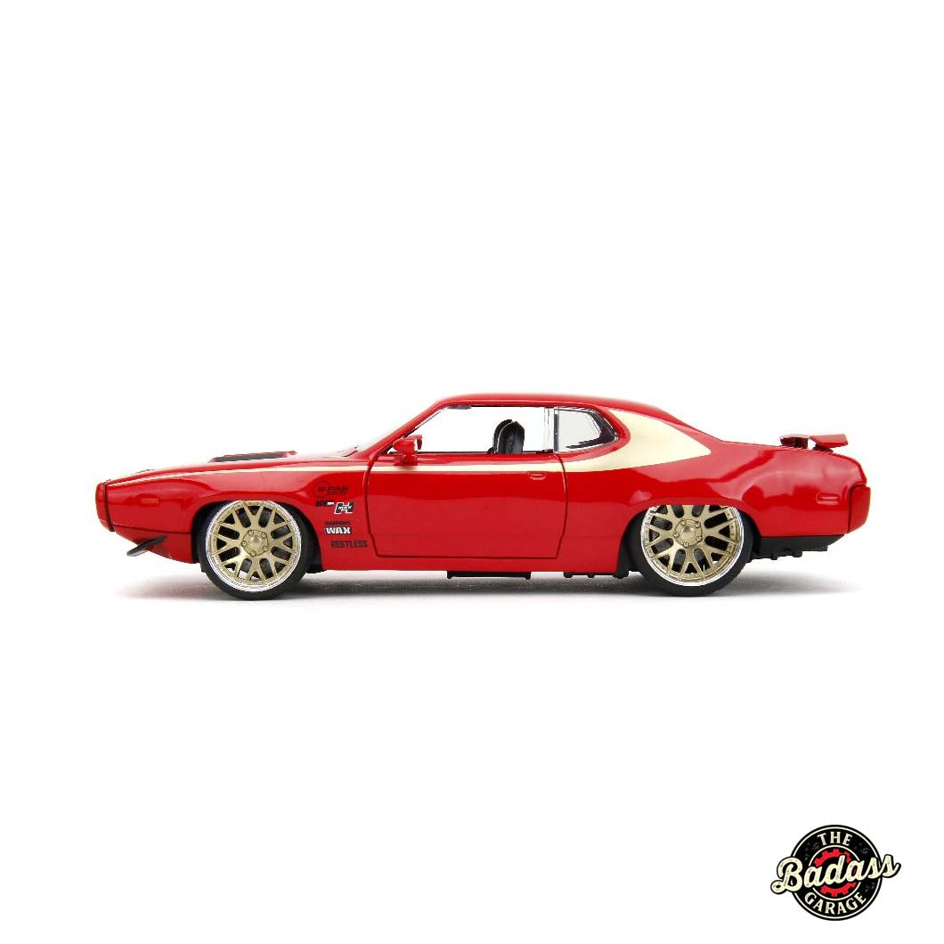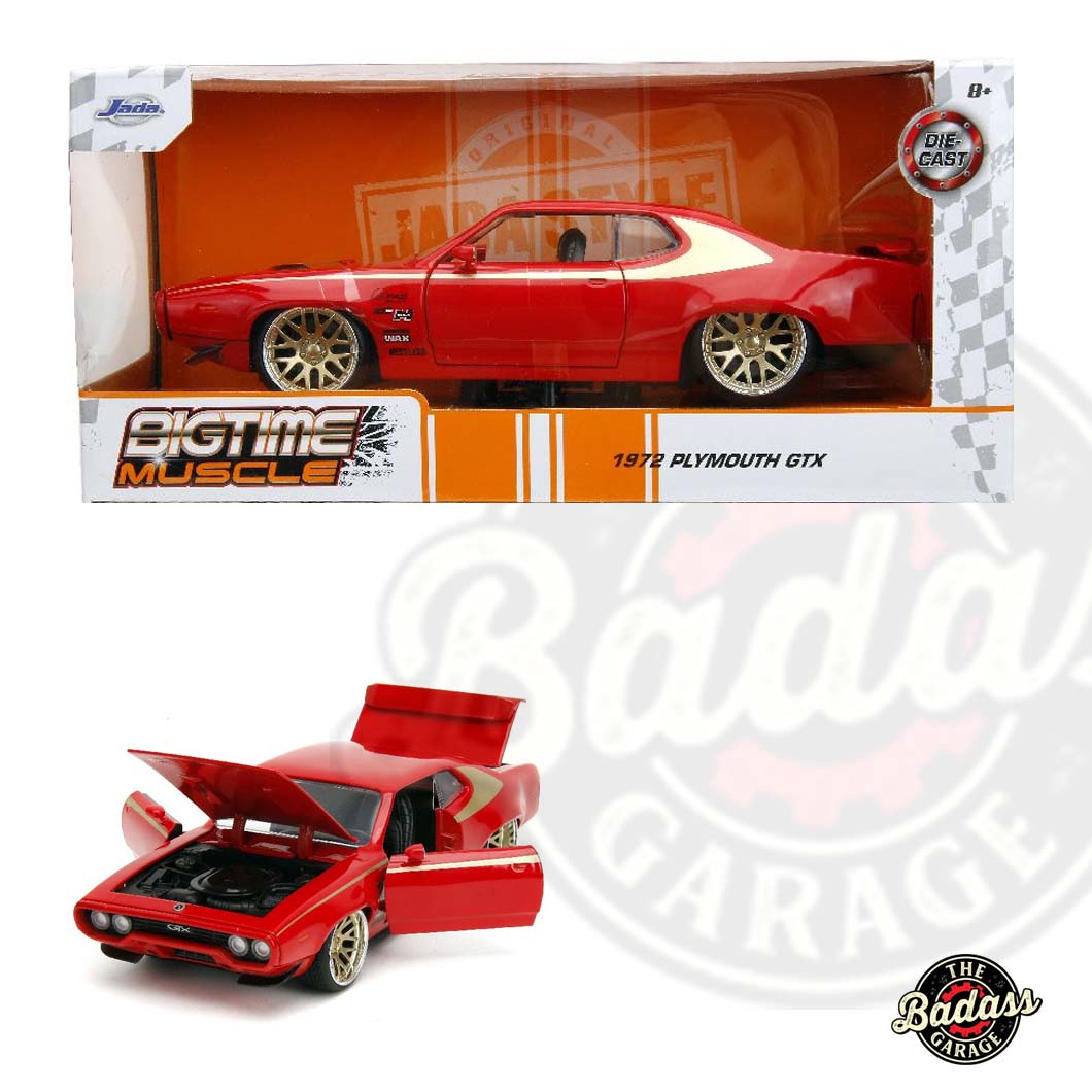 Add a touch of classic muscle to your collection with the Jada 1/24 Scale “BIGTIME Muscle” 1972 Plymouth GTX in striking Red with Gold Wheels. This eye-catching diecast metal model car brings the vintage appeal of the 1972 GTX to life with a bold red finish and gleaming gold wheels. The detailed craftsmanship showcases the iconic design and powerful presence of the original muscle car, from its aggressive stance to the vibrant color accents. Perfect for both enthusiasts and collectors, the “BIGTIME Muscle” 1972 Plymouth GTX in Red with Gold Wheels is a standout piece that embodies the spirit of classic American performance.