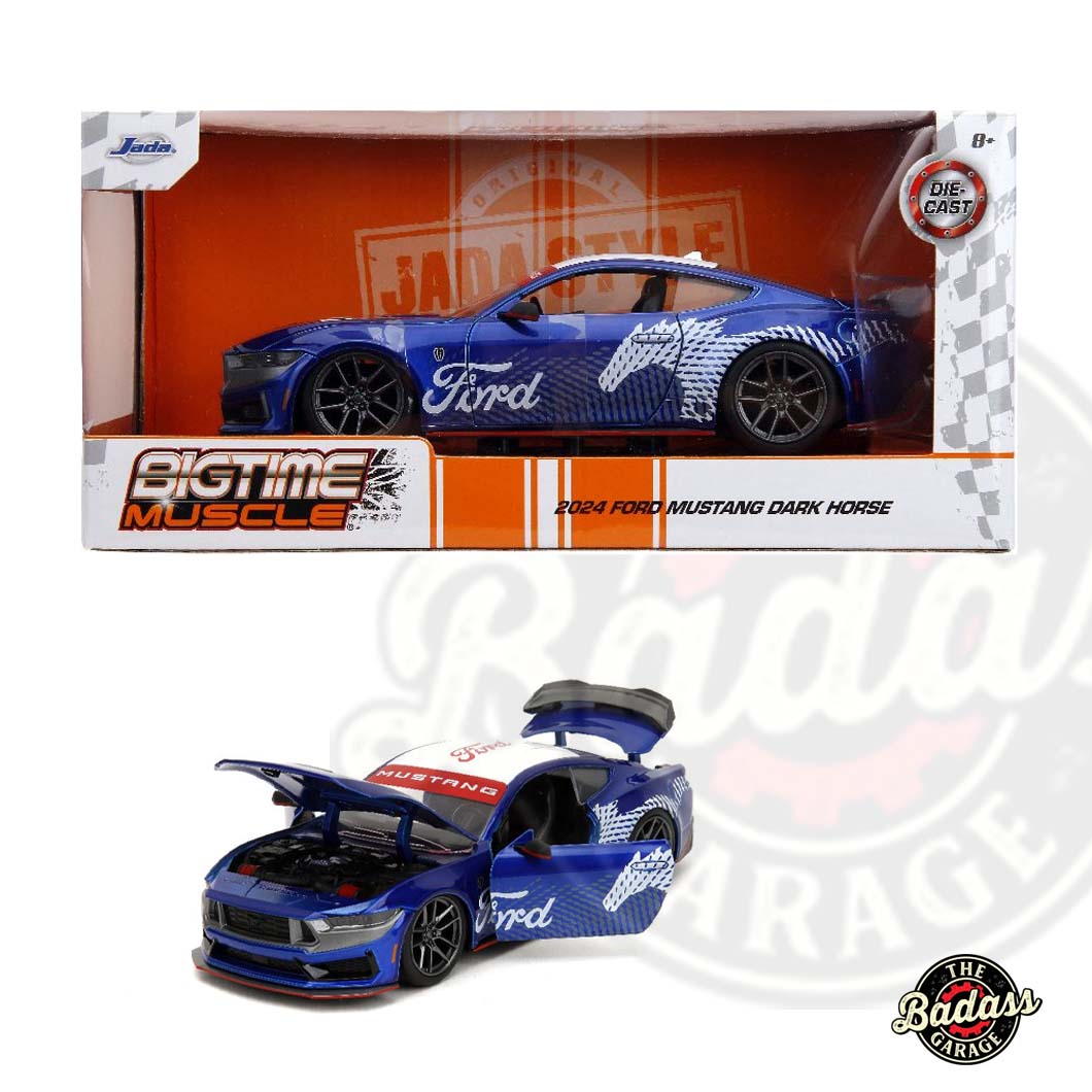 Introducing the Jada 1/24 Scale “BIGTIME Muscle” 2024 Ford Mustang Dark Horse in Candy Blue, an authentically licensed product from Ford. This true American muscle car is meticulously replicated in a 1:24 die-cast model, crafted with durability in mind, featuring 100% die-cast metal and premium rubber tires. Utilizing a high-end casting method, this model boasts rich details, including an opening hood, doors, detailed interior, and trunk. A premium addition to any Ford collection, this die-cast model is a must-have for enthusiasts seeking quality and authenticity in their collectibles.