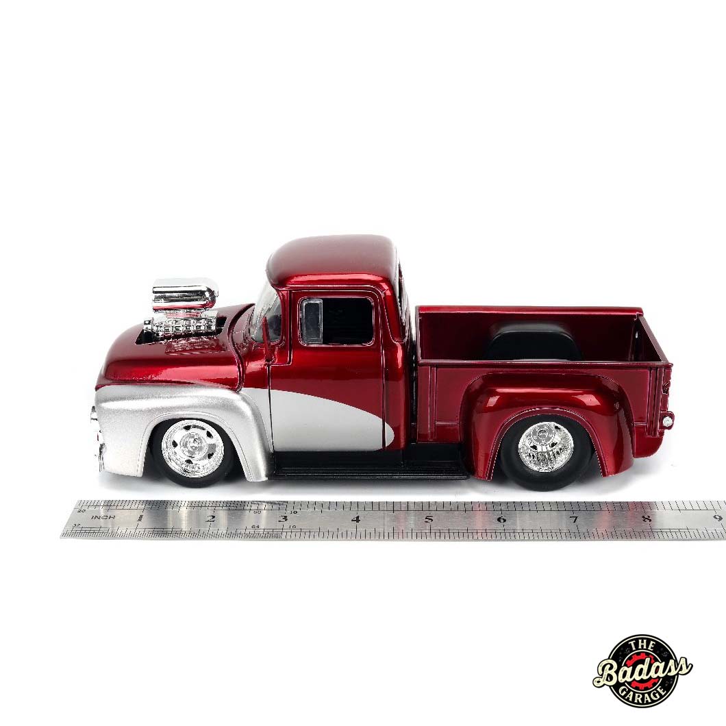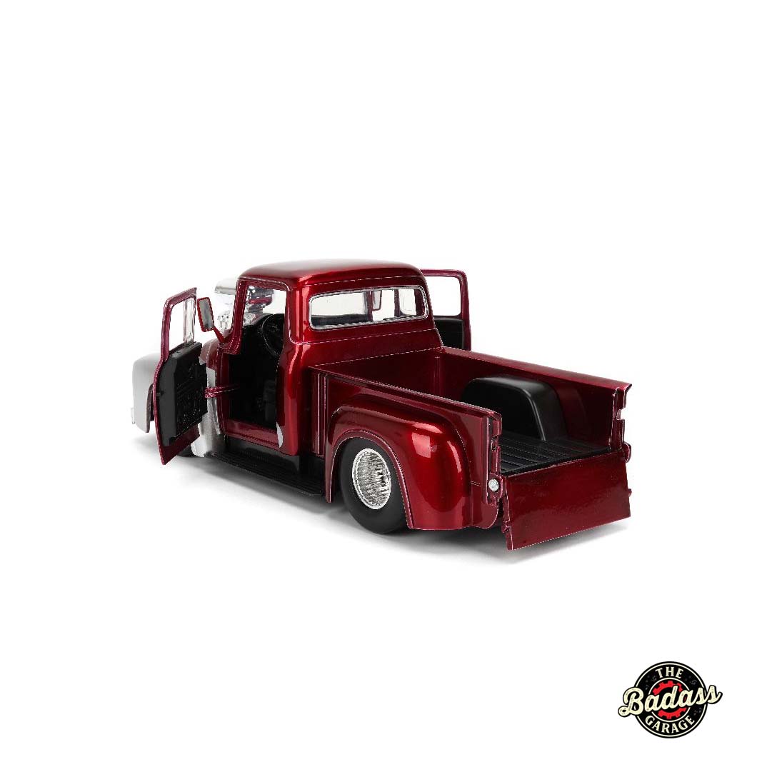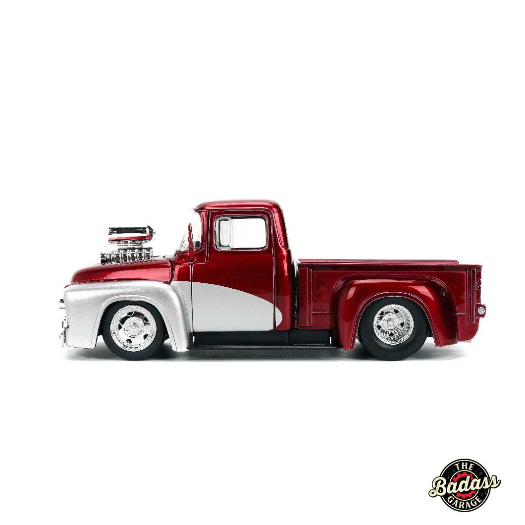 1:24 scale diecast 1956 Ford F-100 with blown engine and high-gloss paint