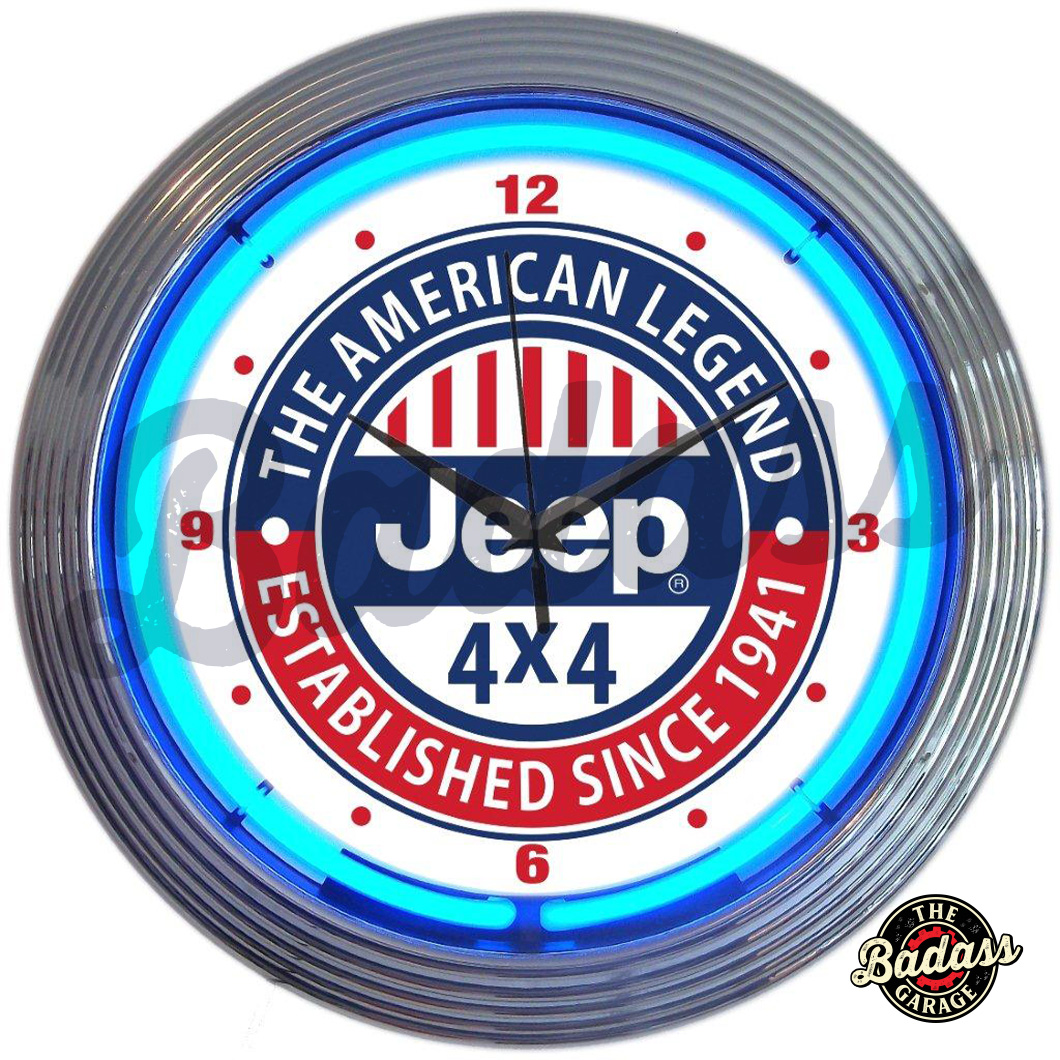 Jeep The American Legend Neon Clocks feature a hand blown ring of real glass neon, generating 25 watts of light. The neon clocks have glass faces and feature multi-tiered art deco styles rims. This clock features a chrome rim with a single ring of blue neon. The quartz movement clock operates on one AA battery (not included). The neon light is powered by an AC adapter (included) that plugs directly into a wall outlet. Give your home the fabulous glow of real neon! FOR INDOOR USE ONLY Product Dimensions 15″W x 15″H x 3″D