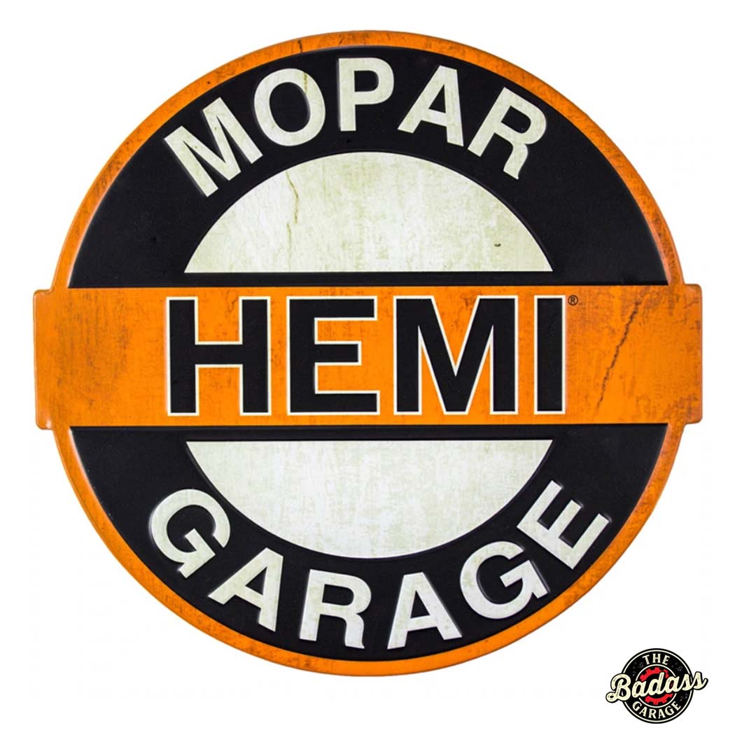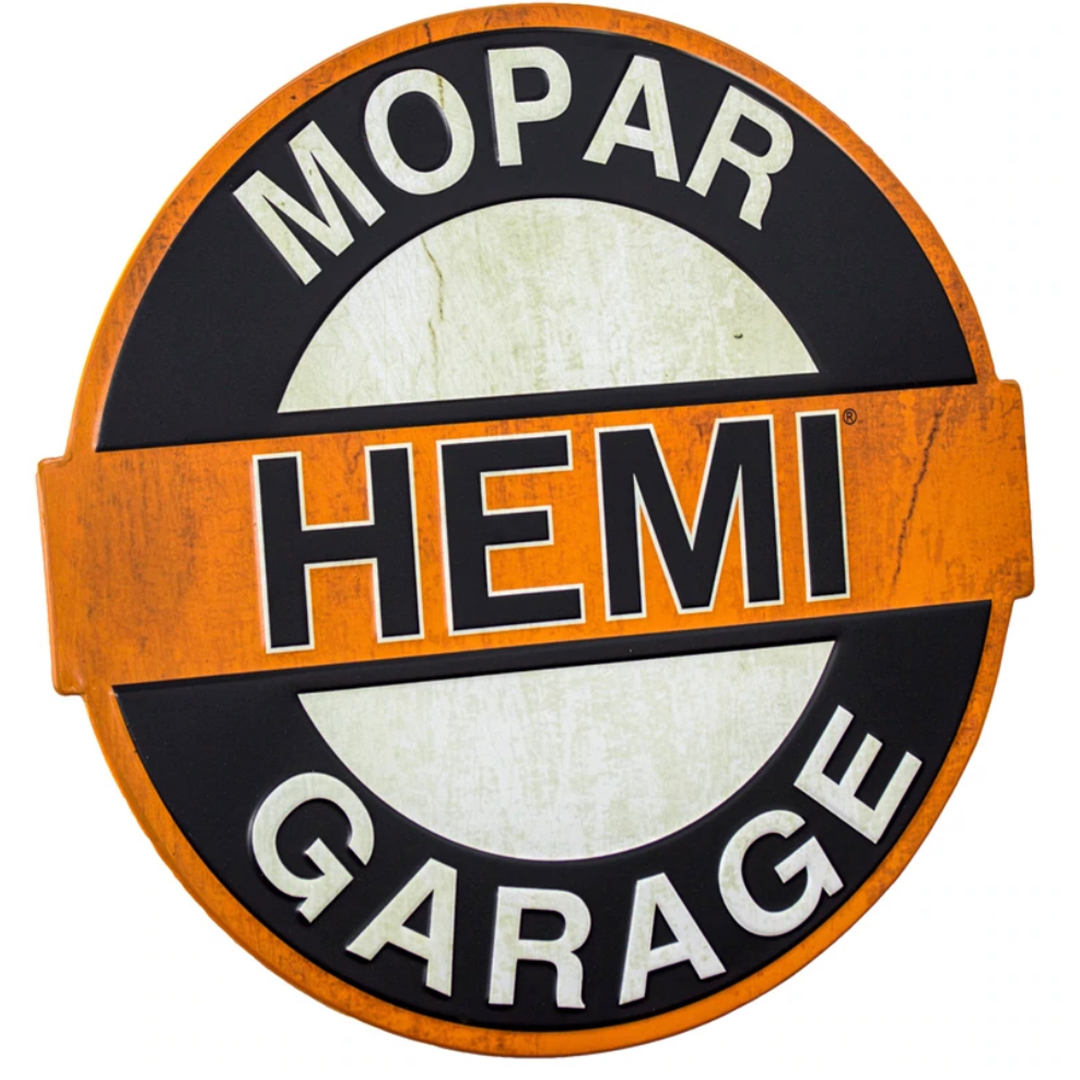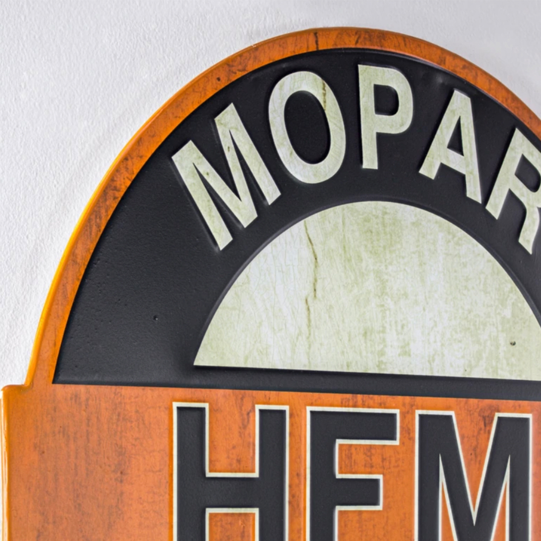 Complete your collection of all things Chrysler with this embossed metal wall decor sign that is a perfect way to show your love of all things Chrysler while also adding some decorative flair to your home. Featuring a black, white, and orange color palette that is rendered with a bit of a weathered and worn look, this charming piece will make a great addition to any diehard Chrysler Hemi fan.