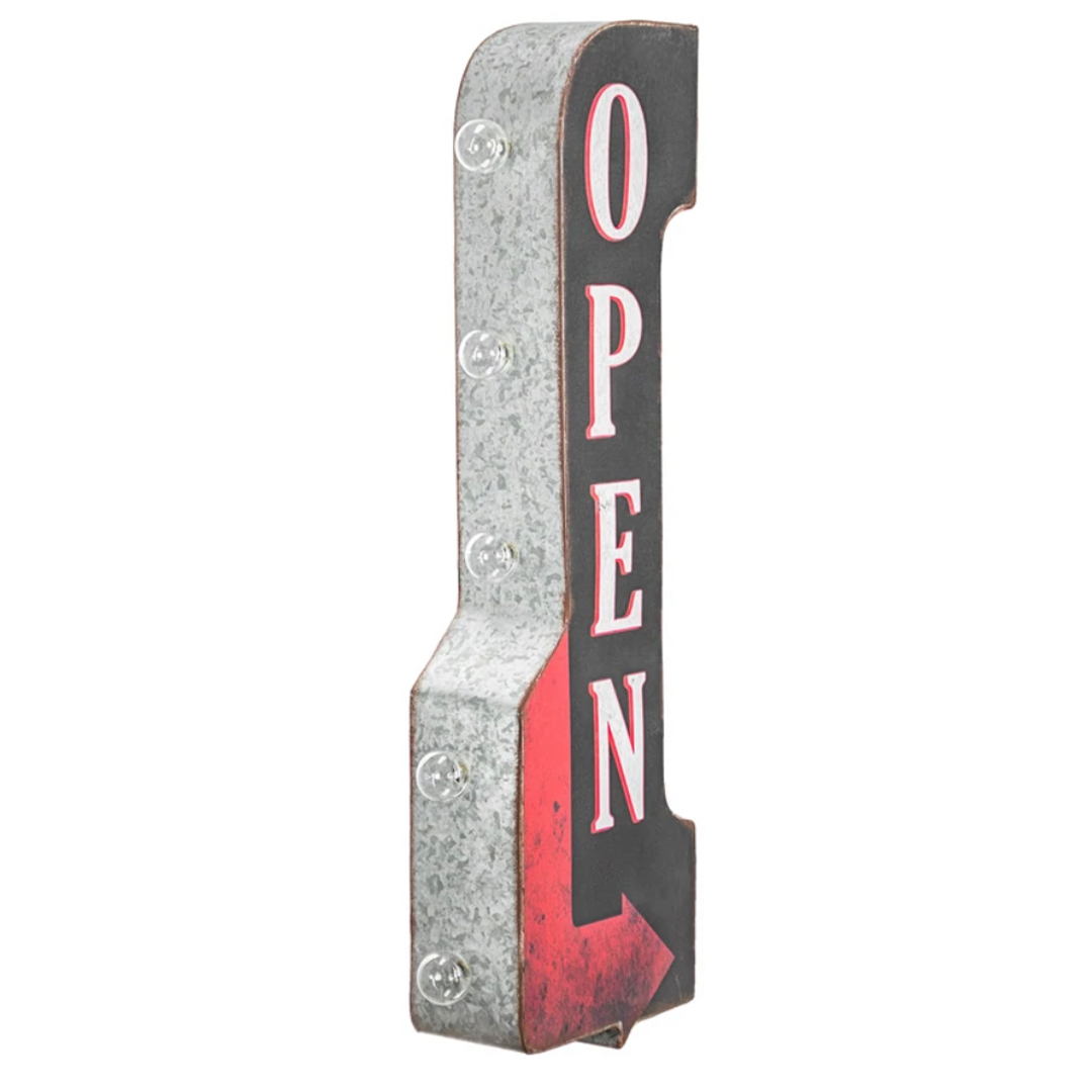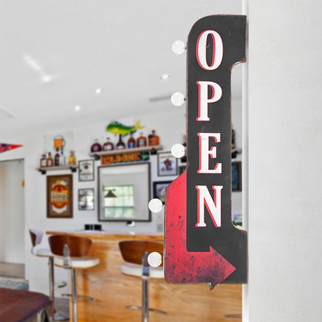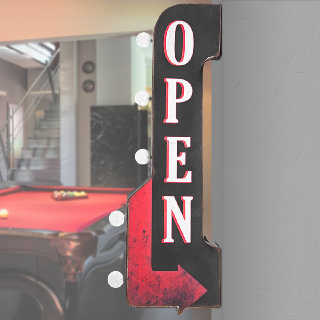 “Declare you are open for business with this vintage-inspired off-the-wall marquee sign that features big, bold lettering against a black background along with a pointed red arrow. Made from strong and sturdy galvanized metal, this catchy piece of wall decor has hints of vintage charm and character. The weathered and distressed look and feel of this piece truly make it feel like a hidden gem from yesteryear.
