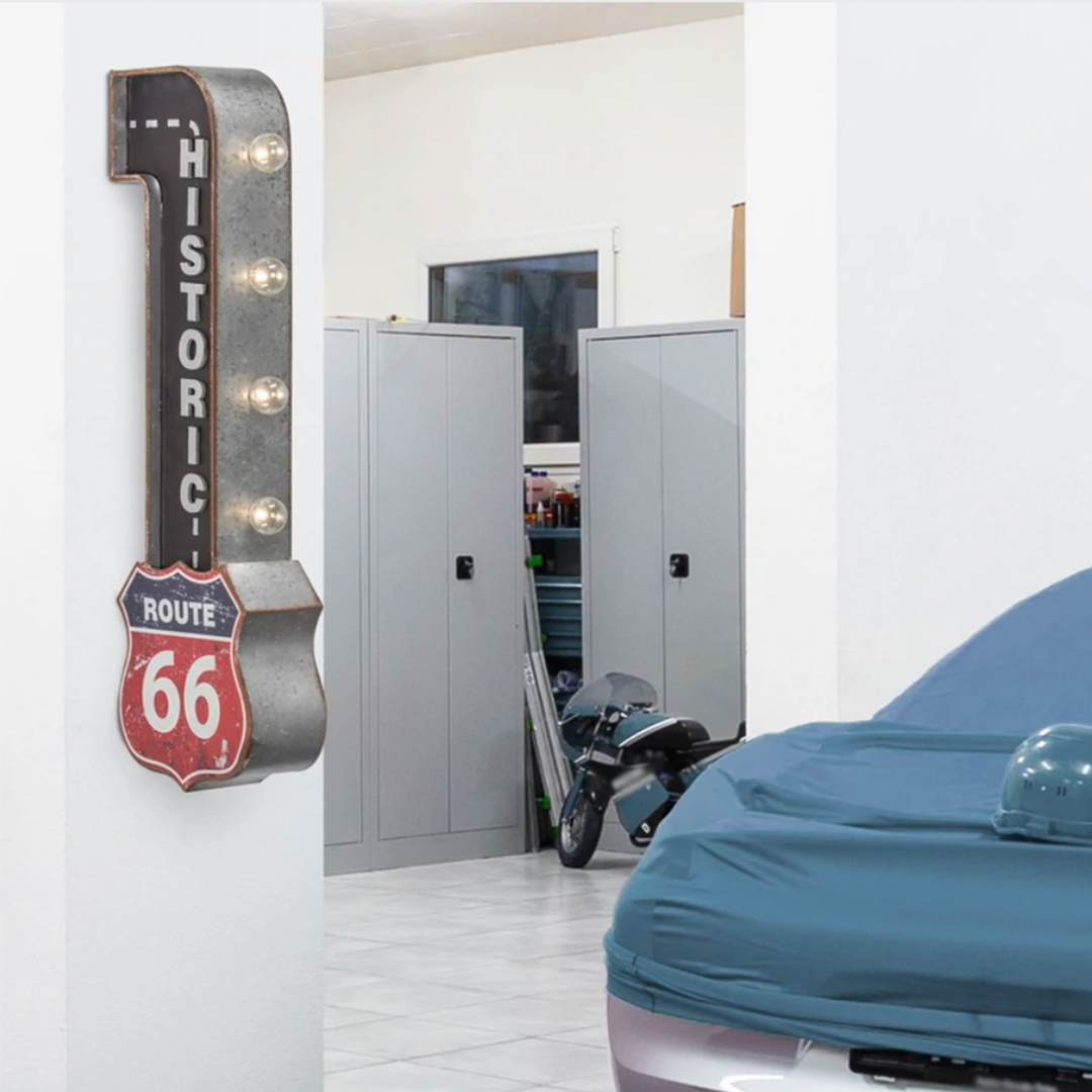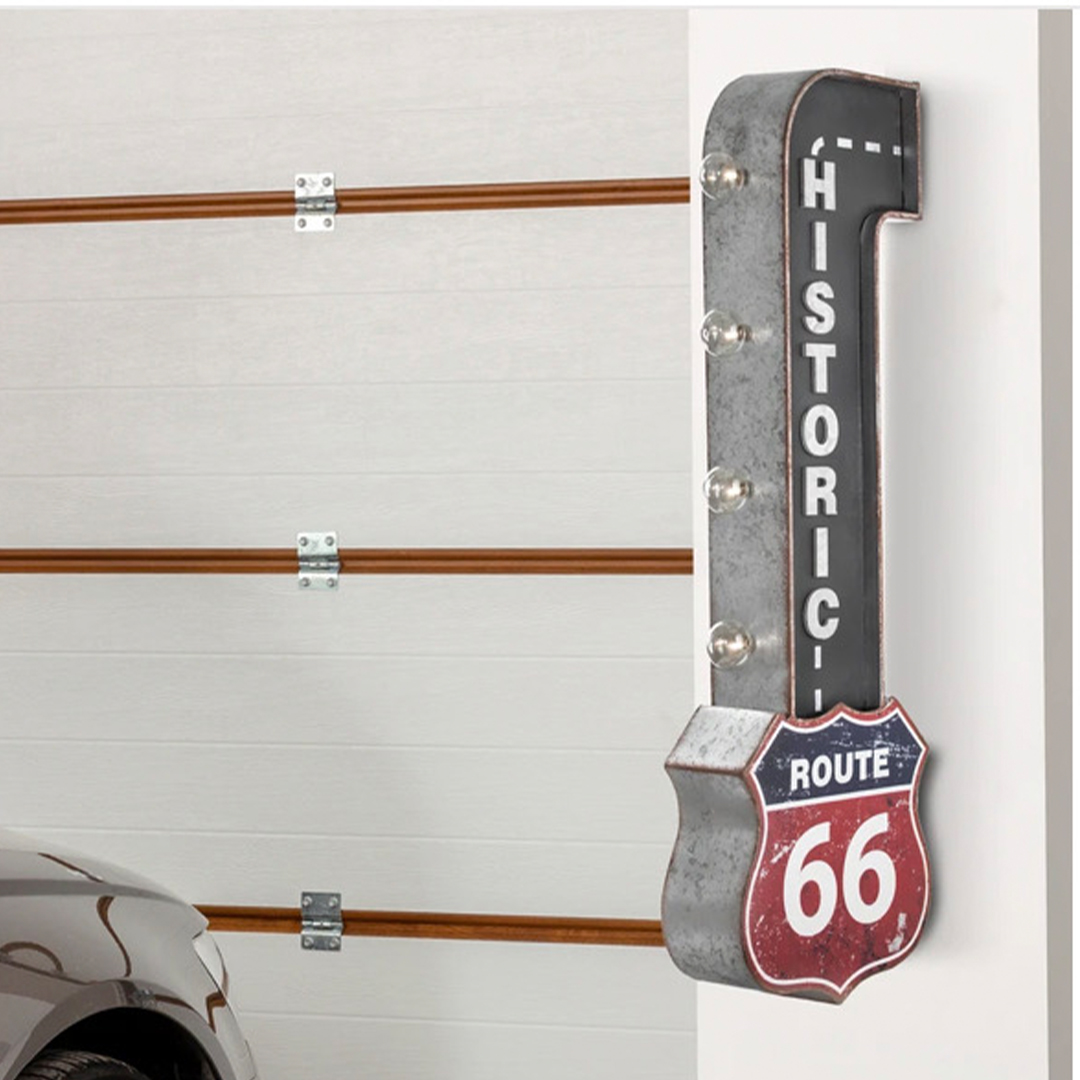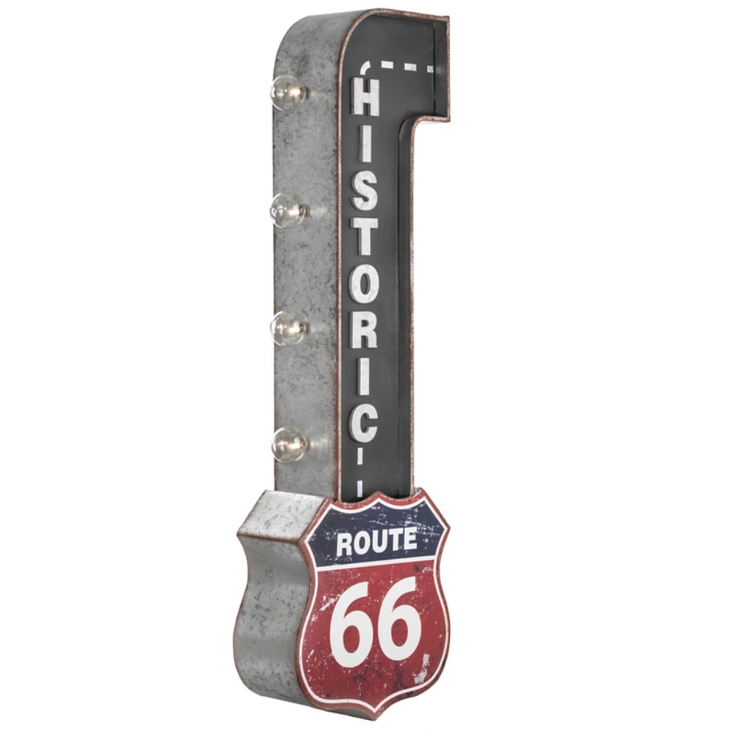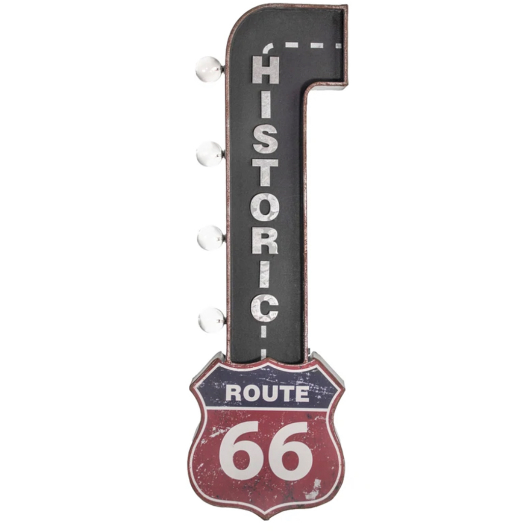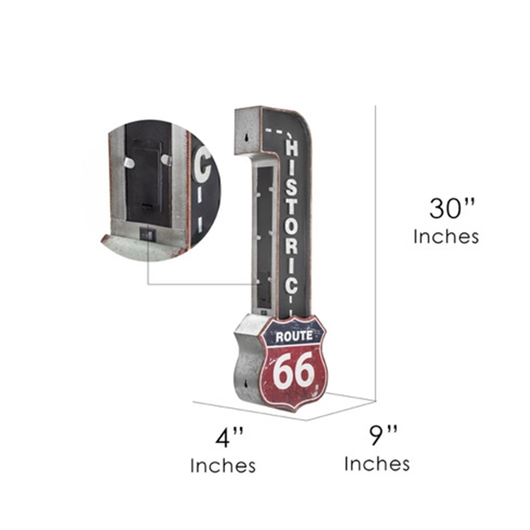 “Add some Americana-inspired decor to your home bar, man cave, garage or game room with this vintage-inspired LED marquee sign that depicts the historic and iconic Route 66 highway sign.Made from galvanized metal with printed graphics and 3-dimensional letters, this charming piece of wall decor offers a bit of Americana culture with nostalgic charm and fun novelty lighting.Equipped with four LED light bulbs, this Route 66 sign makes for a catchy piece of wall decor as well as an ambient lighting option. Powered by two AA batteries (not included), there’s no need to worry about unsightly or tangled cords. And a simple on/off toggle switch on the back allows for easy operation. Plus, two keyhole hooks on the back, make hanging a breeze. This nifty lighting decor piece also comes with a replacement bulb for your convenience. A perfect gift idea for Father’s day, dad’s birthday, or for anyone that’s a fan of road trips, On the Road, and classic American culture, this LED sign will surely stand out and shine bright!” Product Dimensions 9.5″W x 30″H x 4″D