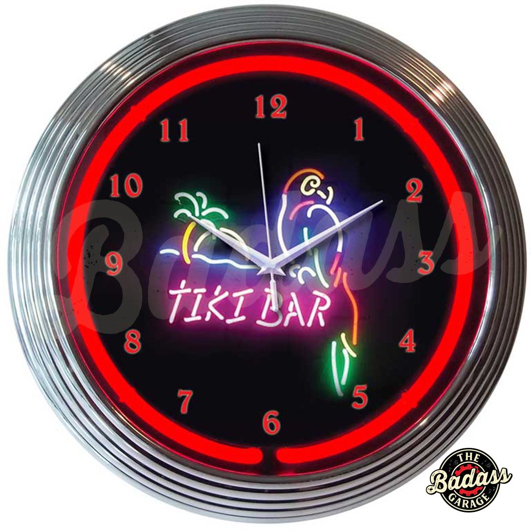 Tiki Bar Neon Clocks feature a hand blown ring of real glass neon, generating 25 watts of light. The neon clocks have glass faces and feature chrome finished, multi-tiered art deco styles rims. This clock features a chrome rim with a single ring of red neon. The quartz movement clock operates on one AA battery (not included). The neon light is powered by an AC adapter (included) that plugs directly into a wall outlet. Give your home the fabulous glow of real neon! Please note: The image on the clock face is a photograph of a neon sign, not real lighted-up neon. The center picture on the clock does not light up. The only real neon you will receive is the single circular ring of neon around the clock face itself. Product Dimensions 15″W x 15″H x 3″D