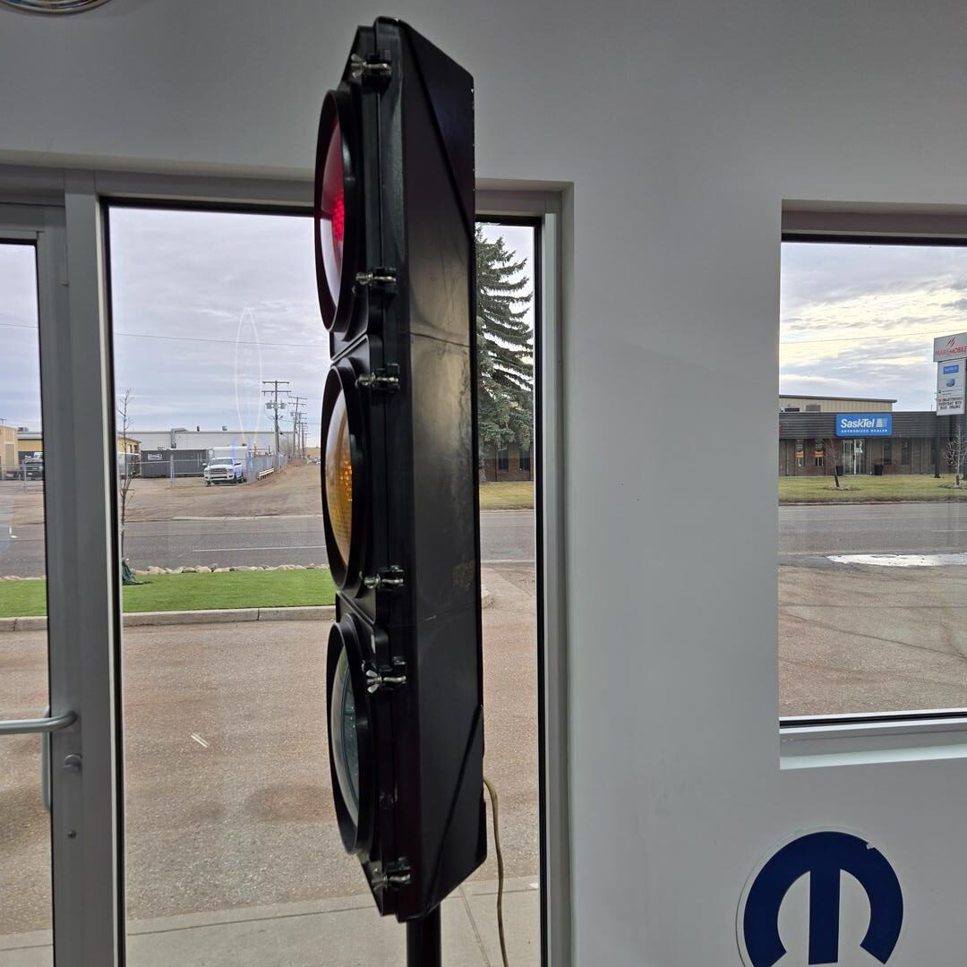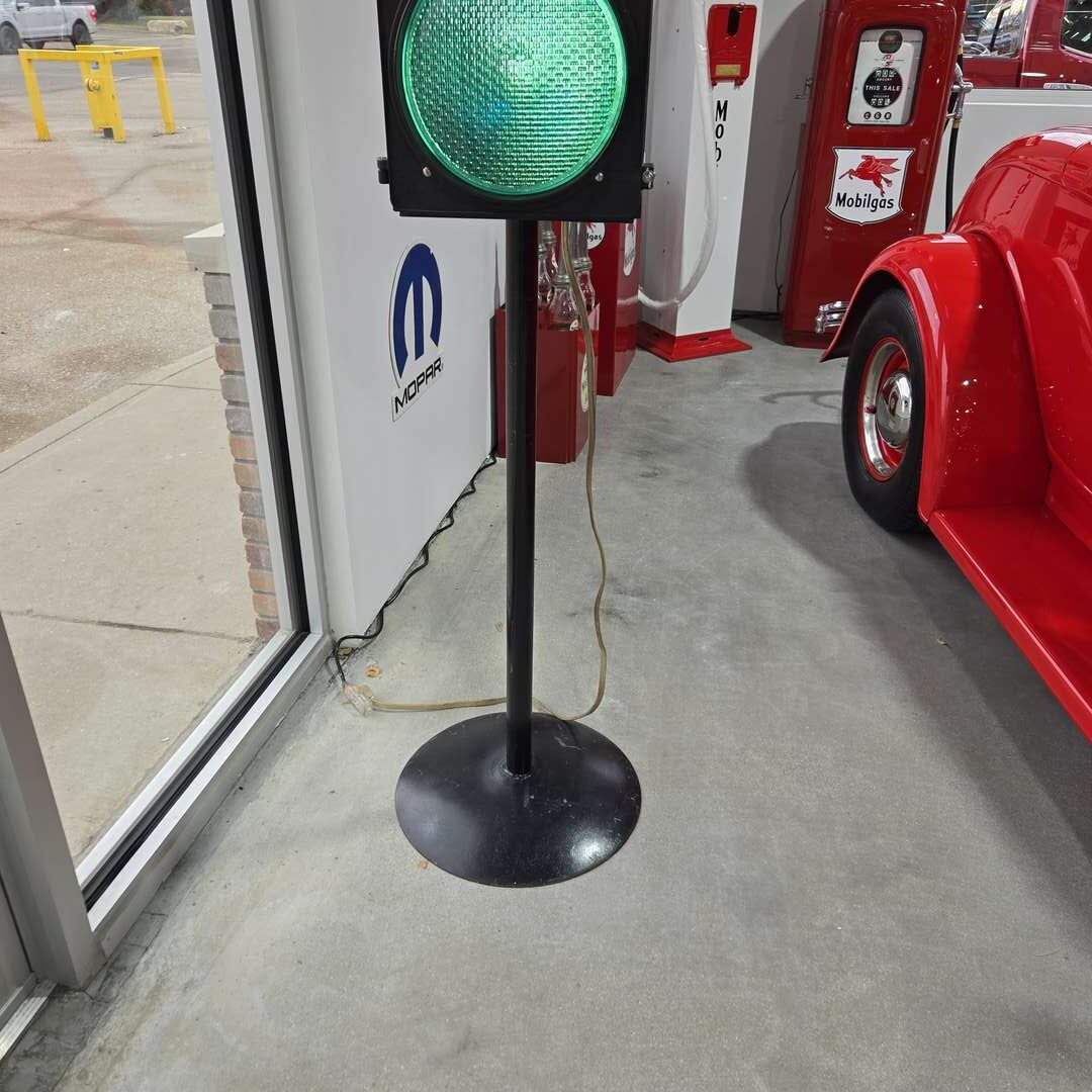 Large traffic light which cycles through all three lights when plugged in, mounted on pole and disc base