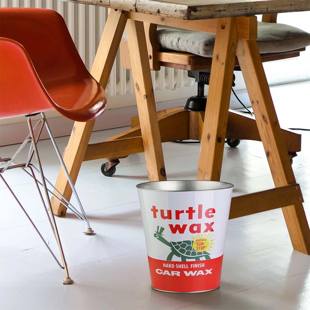 Keywords: Turtle Wax trash can, car care decor, garage waste bin, vintage detailing shop accessory, classic auto wax can bin, retro car wash decor