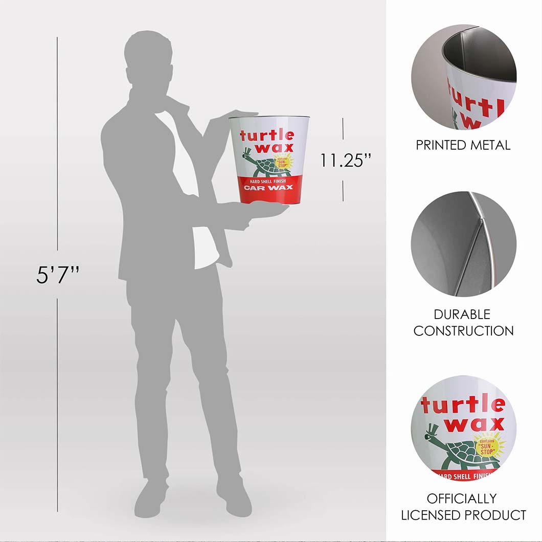 Bring that classic car care nostalgia to your garage or man cave with the Turtle Wax Trash Bin. Styled after the iconic “Hard Shell Finish” Turtle Wax can, this metal bin delivers throwback vibes with a fresh polish. Featuring the legendary green turtle, bold red lettering, and the vintage “Sun-Stop” badge, it’s the kind of trash can that gets noticed—and not just when it’s full.