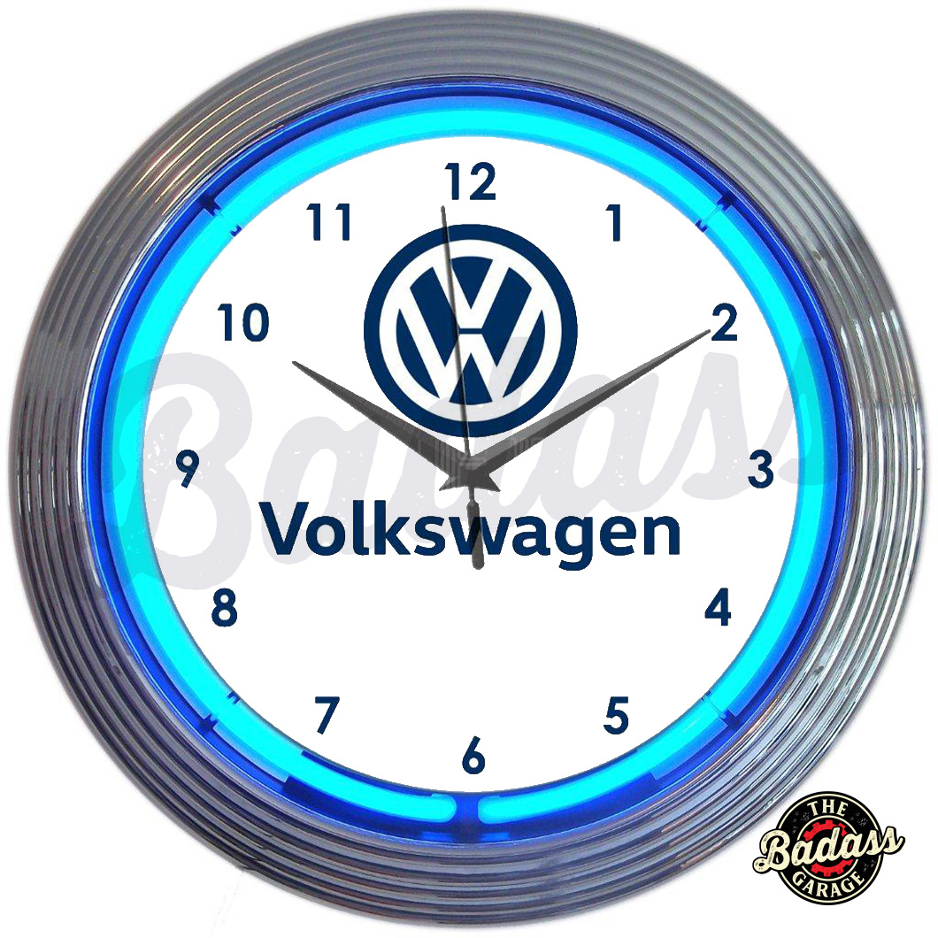 Volkswagen Neon Clocks feature a hand blown ring of real glass neon, generating 25 watts of light. The neon clocks have glass faces and feature multi-tiered art deco styles rims. The Volkswagen neon clock features a chrome rim with a single ring of blue neon. The quartz movement clock operates on one AA battery (not included). The neon light is powered by an AC adapter (included) that plugs directly into a wall outlet. Give your home the fabulous glow of real neon! FOR INDOOR USE ONLY Product Dimensions 15″W x 15″H x 3″D